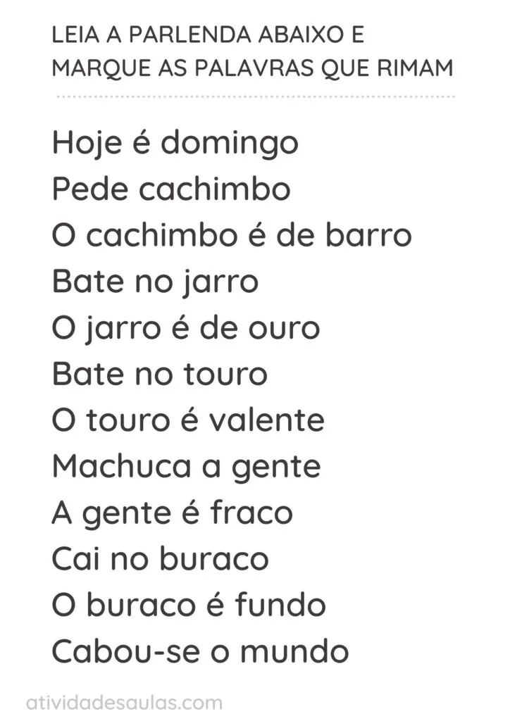Por fim, os alunos terão contato com uma parlenda popular, texto oral tradicional repleto de ritmo e musicalidade. A leitura e recitação coletiva permitem que as crianças percebam o som das palavras, a cadência dos versos e as rimas que se repetem. Ao marcar as palavras que rimam, os estudantes começam a compreender que os sons finais das palavras criam uma espécie de “eco”, o que torna a fala divertida e fácil de lembrar. Essa é uma excelente oportunidade para ampliar o vocabulário, trabalhar entonação, ritmo e desenvolver a escuta atenta dentro do processo de alfabetização.