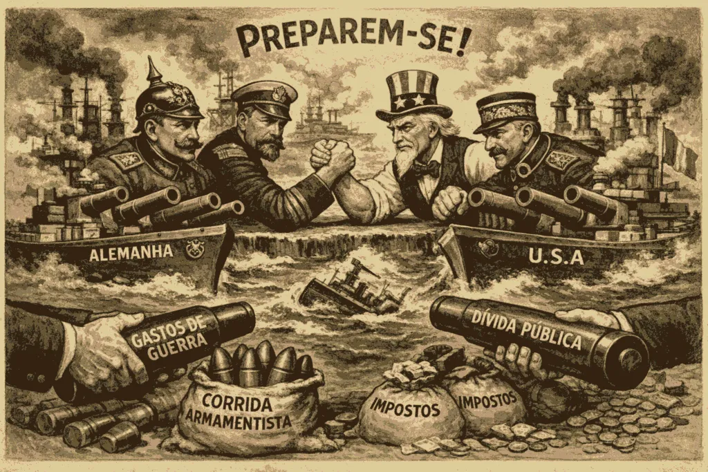 b) Mostra o clima de tensão, competição e preparação para a guerra antes de 1914.